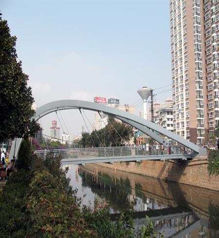 橋面系梁采用3根截面尺寸300×400mm的箱形梁加橫向聯(lián)系桿件制作而成,系梁在橋梁立面呈圓弧形,圓弧半徑R=235.7m;橫梁采用φ245×18mm的無縫鋼管,橫梁與系梁焊接連成整體,通過拉桿與拱肋連接。設(shè)計(jì)概算230萬元設(shè)計(jì)概算230萬元