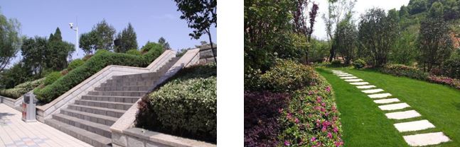 臺階是為解決園林地形高差而設置的,它除了具有使用功能外,由于其富有節奏的外形輪廓,具有一定的美化裝飾作用。設計時應結合具體的地形地貌,尺度要適宜。一般臺階的踏面寬30~38cm,高度為10~17cm,踏步數不少于兩級,側方高差大于1.0m的臺階應設防護設施。平臺的寬度一般為158cm。