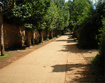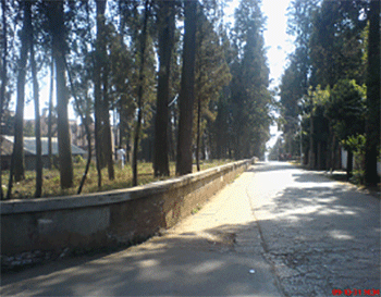 現狀道路為6.0~7.5m寬的混凝土路,雙向通行,道路前半段兩側均為高大的雪松,雪松種植與道路縱向平行,中段道路主要穿越一處柏樹林,柏樹分布規律為越靠近中間現狀路,樹木越密集,道路末段西側為法國梧桐樹,法國梧桐樹種植與道路縱向平行。