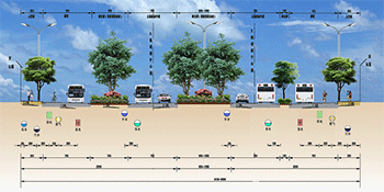 在以上原則的指導下,經過方案對比,龍泉路最終的平面線形根據道路沿線植被分布的情況分段確定,第一段道路沿線為雪松,主要思路為已現狀的老路作為入城方向的主線機動車道;現狀東側雪松形成6.0m寬綠化帶作為中央綠化帶;現狀西側雪松形成7.0m寬綠化帶作為入城方向主線和輔道的隔離綠化帶。道路向西側展寬,形成入城方向輔道和人行道。道路向東側展寬,形成出城方向車行道、輔道、人行道。