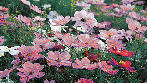 玉簪(白)、龍面花(白、黃、粉)、雞冠花(紅、黃)、蔥蘭(白)、飛燕草(紫)、槭葵(紅)、翠菊(白)、錦葵(白、紅、紫)、荷蘭菊(堇紫)、黑心菊(共褐)、金雞菊(黃)、霍香薊(白、粉、蘭)、霞草(粉)、鳳仙花(白、紅、粉)、紫茉莉(黃、紅、紫)、金魚草(黃、紅、門)、孔雀草(黃、褐)、晚香玉(白)、福祿考(黃、紫、紫)、黃花菜(黃)、金盞菊(黃)。香石竹(紅、白)、一點纓(黃)、麥桿菊(黃)、桔梗(堇紫)、醉蝶花(白、粉、紫)、香雪球(白、紫)、萬壽菊(黃)、一串紅(紅、白、紫)、美女櫻(白、粉)、射干(黃)、萱草(黃)、花菱草(白、黃)、關人蕉(黃、紅)、百合(白、橙)、百日草(白、黃、紅)、天人菊(黃)、紫宛(堇紫)、雛菊(白、粉)、半支蓮(白、黃、紅)、馬藺(蘭)、矮牽葉(白、紅、紫)、金光菊(美)、虞美人(紅、白)、曼陀羅(白)、蜀葵(白、紅、紫)、唐菖蒲(白、黃、紅)、蛇目菊(黃)、一枝戰花(黃)、酢漿草(白)、耬斗萊(紫)、千日紅(紅)、雁來紅(紅)。