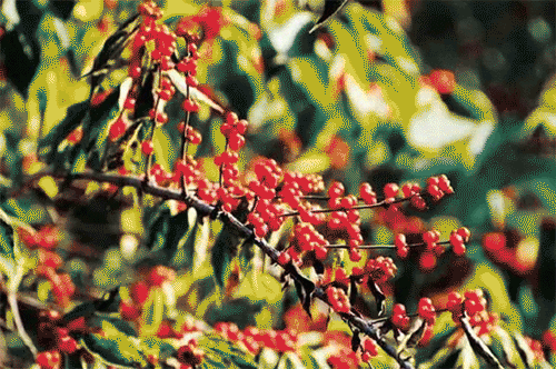 冬青(紅)、蘋果(紅)、珊瑚樸(紅)、枸骨(紅)、無患子(黃)、火棘(紅)、珊瑚樹(紅)、省沽油(黃)、平枝枸子(紅)、李(紅)、莢迷(紅)、南天竹(紅)、梨(黃)、石榴(紅)、香圓(黃)、銀杏(黃)、金銀木(紅)、杏樹(黃)、野鴨椿(紫紅)、葡萄枸子(紅)、柿樹(黃)、花椒(紅)、小檗(紅)、黃山欒(紅)、虎刺(紅)、柑橘(黃)、花楸(紅)、木瓜海棠(黃)、枇杷(黃)、山雞椒(紅)、窄葉火棘(紅)、木瓜(黃)、海州常山(紅)、枸杞(紅)、櫻桃(紅)、楊梅(紅)、欒樹(粉紅)、羅漢松(紅)、山楂(紅)、忍冬(紅)、桃葉珊瑚(紅)、金絲吊蝴蝶(紅)、桃樹(黃)、天目瓊花(紅)。