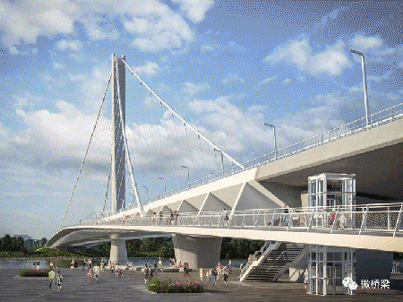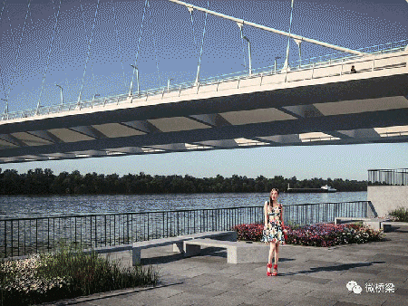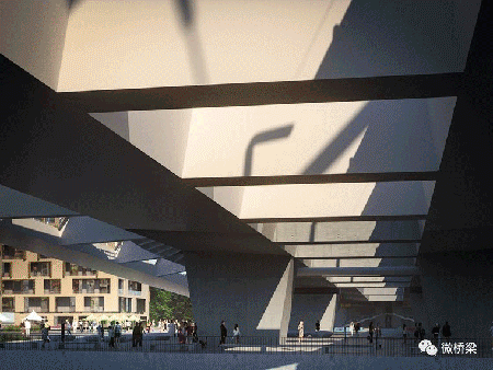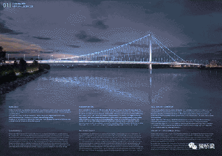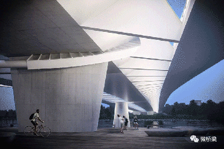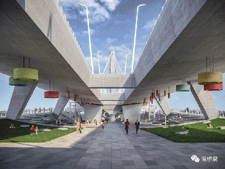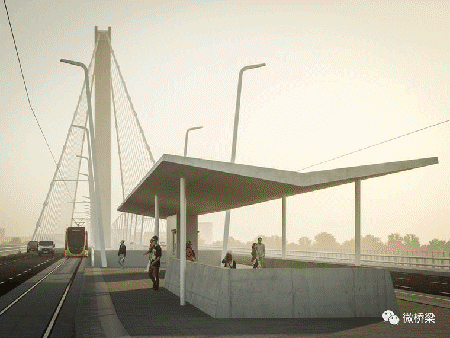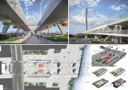 除了一般的外觀,橋梁的建筑解決方案強烈關(guān)注人類互動。目的是在結(jié)構(gòu),河流和移動的人之間創(chuàng)造有趣的,不斷變化的空間關(guān)系,從而喚起情感并提供獨特的穿越個人體驗。同樣重要的是將橋梁的周圍環(huán)境形成有機地連接到該地區(qū)城市發(fā)展的高質(zhì)量空間,特別是沿著河流朝向KopasziGát和北部的Csepel公園區(qū)域。分裂的上部結(jié)構(gòu)在橋腳處提供了一個光照空間。作為布達河岸長廊的一部分,進場橋作為一個活躍的多功能廣場,成為城市環(huán)境的有機組成部分,為橋梁的社會融合和可持續(xù)發(fā)展提供服務(wù)。