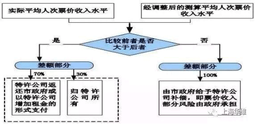 北京地鐵4號線PPP項目中政府方和社會投資人的順暢合作,得益于項目具有合理的收益分配機(jī)制以及有效的風(fēng)險分擔(dān)機(jī)制。4號線PPP項目票價補(bǔ)償和返還機(jī)制見圖: