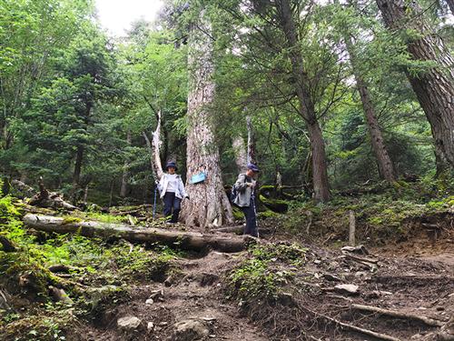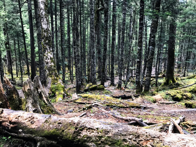 良好的生態(tài)環(huán)境造就了這里豐富的生物鏈,在高大密密麻麻冷杉林里徒步,曬不到太陽,所以不用怕高原強烈的紫外線。上下坡的坡度幾近八十度,攀爬起來很是吃力,加之地面潮濕路滑,每走兩步都需要停下腳步稍作休息,心臟驟跳不停,分分鐘爆表的節(jié)奏在躍動。