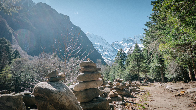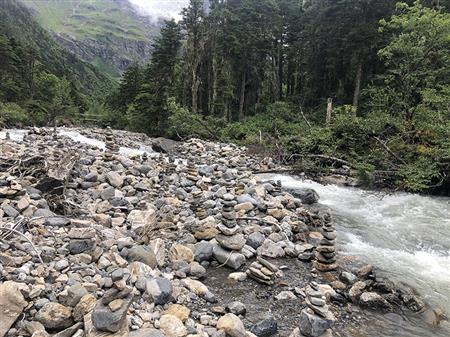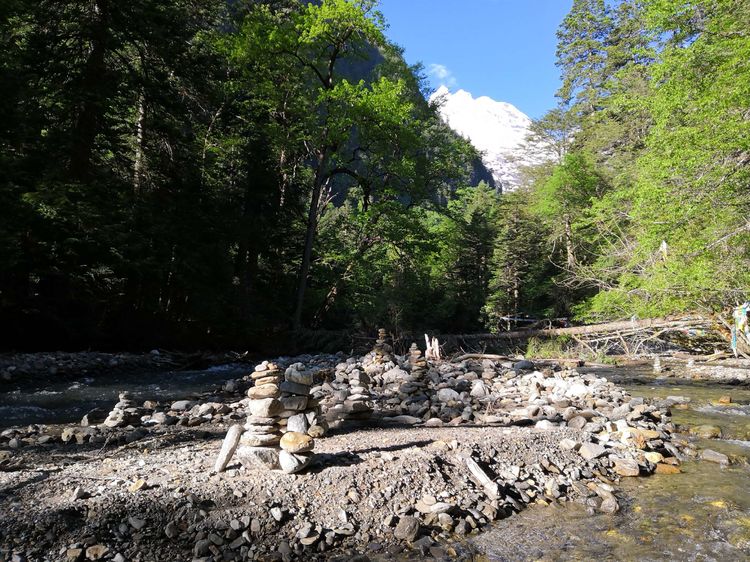沿著山谷河流往前走,河邊灘涂上堆起了各式瑪尼堆,五彩經幡也在山谷飄揚。不經意間,這些都提醒我們梅里雪山是藏族人民心中的神山啊。