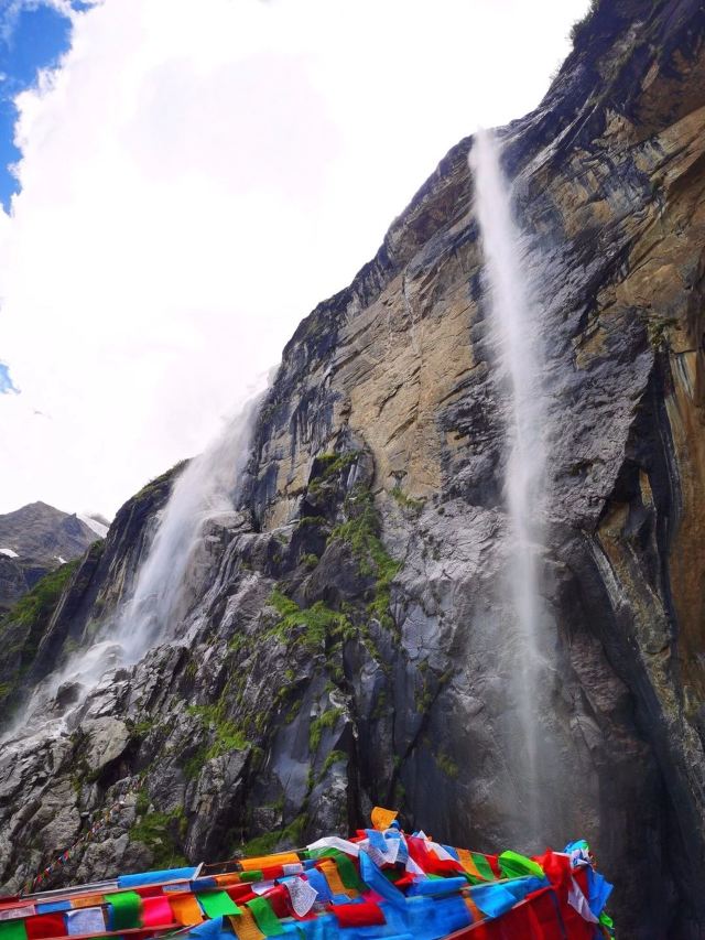 有懸?guī)r傾瀉而下的瀑布被稱為“雨崩神瀑”,海拔3657米,藏族人以到雨崩神瀑下沐浴作為一種潔凈心靈的修煉。雨崩神瀑景色隨季節(jié)變化而變化。春夏冰雪消融,瀑布水流增大,落入地面,濺沫飛揚,雨季瀑布較為壯觀,平時只是山上垂下如哈達般千絲萬縷的水線。