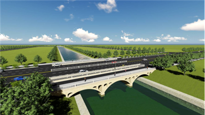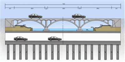 海河橋分三幅進行設計,為3-20m鋼筋混凝土板拱橋。上部為鋼筋混凝土板拱,主拱跨徑20m,矢高5m,矢跨比1/4,下部構造為矩形實體墩、U形臺。橋梁墩臺支撐于下部通道頂,通道底部采用樁基礎。橋梁全長76m。