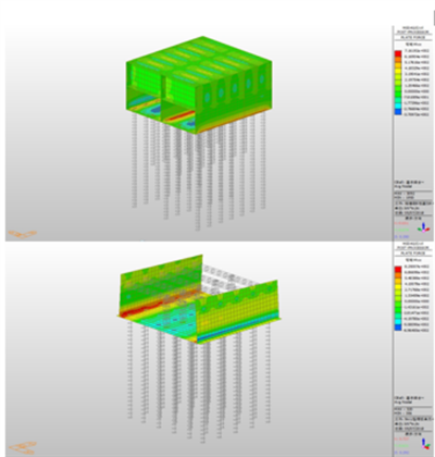 車庫與下穿隧道基礎共用采用有限元分析軟件Midas進行受力分析,并采用樁基共用,下穿作為車庫的擴大基礎。