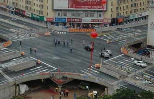 該工程采取“龜背”立交模式,通過將快速交通系統(tǒng)機(jī)動(dòng)車道適度提高上跨,慢速交通系統(tǒng)非機(jī)動(dòng)車道和行人通道適度降低下穿,